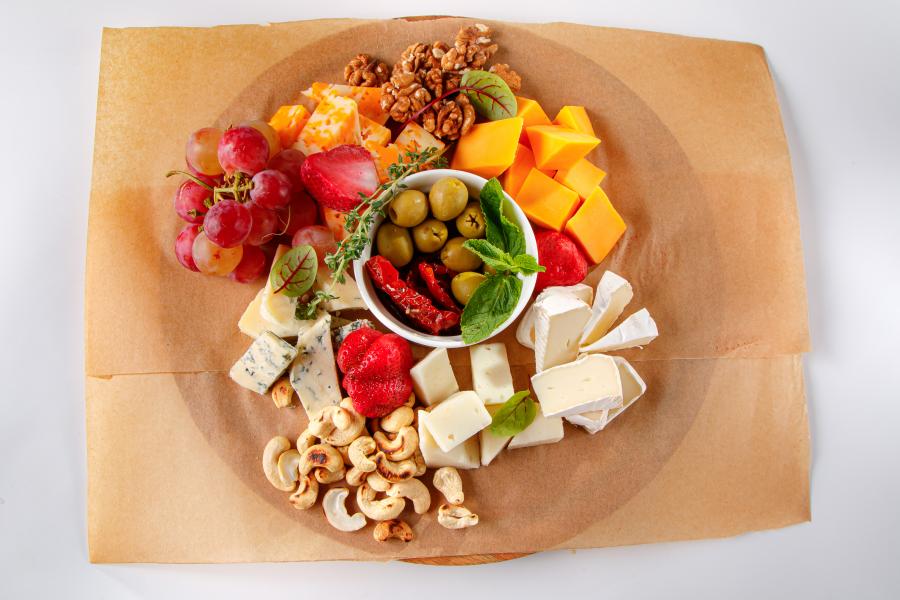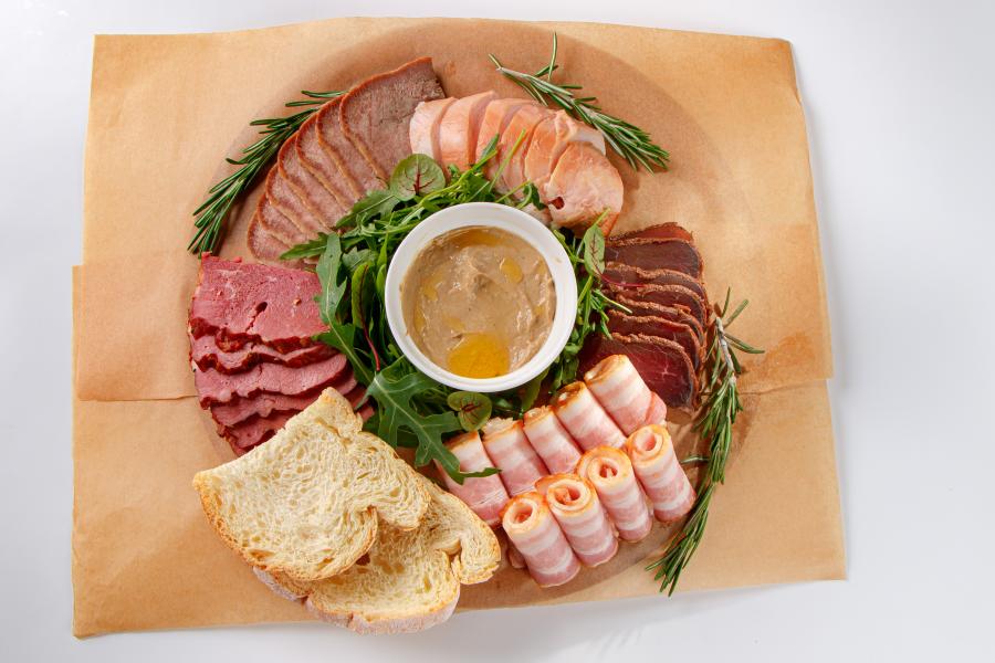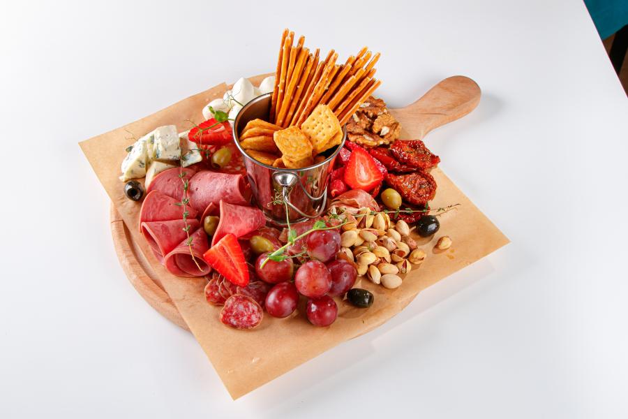 Фирменный сет из мясных деликатесов ( крекер, соленые палочки, прошшуто, колбаски мини салями, утиная грудка сыро копченая, колбаса сыровяленая с белой плесенью, чорриззо итальянская пряная колбаса острая, мацарелла мини шарики, томаты вяленные, дор блю, говядина варено копченная , виноград, фисташки, грецкий орех, клубника, оливки,маслины