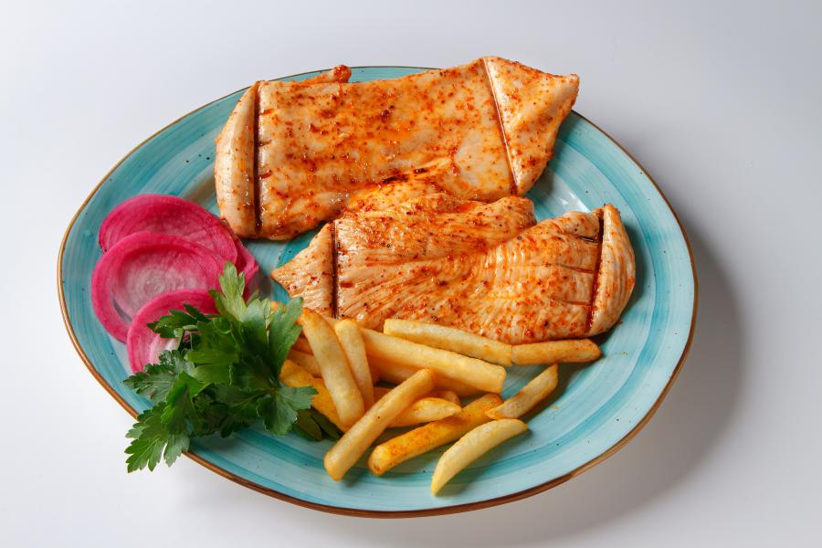 Пряное филе курицы, запекается на мангале, подается с картофелем фри