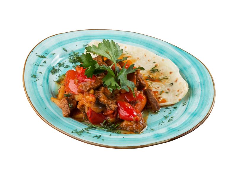 Рубленая телятина, тушеная с овощами в казане, подается на тонком лаваше