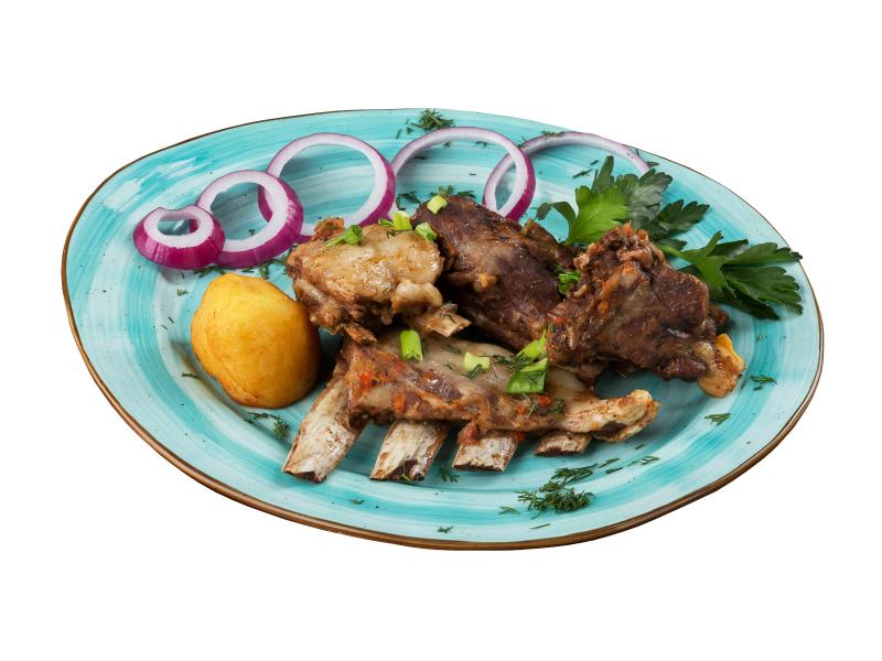 Тушенные ребра с дольками печеного картофеля и кольцами лука