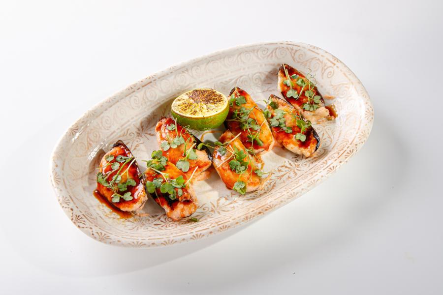 Запеченные мидии с рыбным кремом, сыром сулугуни и соусом "унаги"