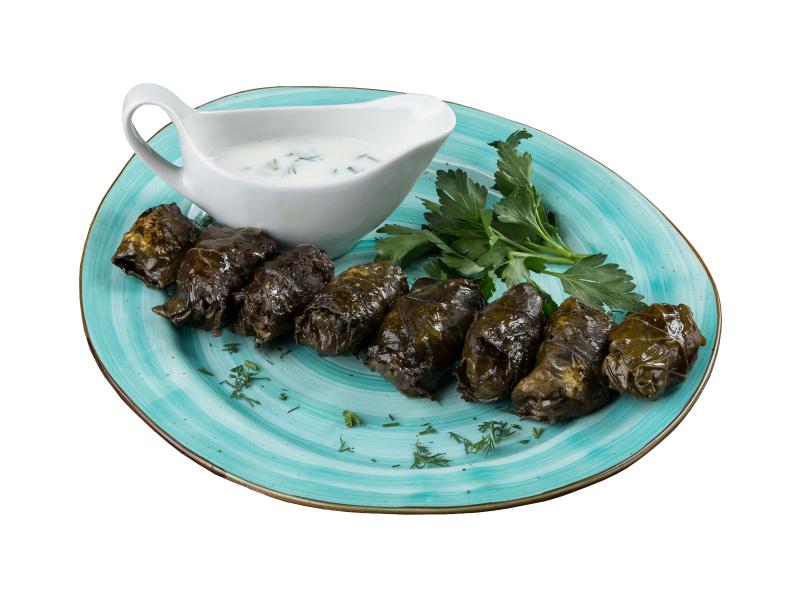 Голубцы из баранины в виноградном листе. Подаются с кефирно-чесночным соусом.